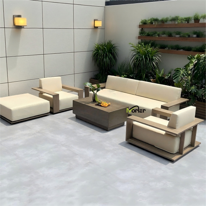 5. Teaková vonkajšia pohovka: Táto pohovka, vyrobená z prírodného teaku vysoko odolného voči poveternostným vplyvom, sa môže pochváliť jemnou zrnitosťou, vysokou stabilitou a pri používaní vytvára luxusnejší dojem, čo z nej robí klasickú voľbu na vytvorenie balkóna v štýle luxusného rezortu.